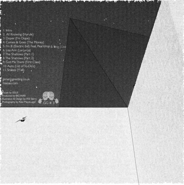With influences as far reaching as Black Sabbath and Goldie, Big War’s beats for Aura are perfectly fitting for Issue. If I should be pushed for a description, I’d liken it to James Pants being dipped in purp and rolled around in tea leaves. In short, Big War is most definitely a name to look out for. We’ll report back soon with a interview with Issue andBig War where we delve into the mysticism of “Aura” and where each of them are looking to in the future, but for now stream the mixtape below through our Bandcamp and download through Mediafire. We’re incredibly proud to have this an exclusive, shout out to Issue, Big War, Generic Greeting crew, Will Berry for all the amazing artwork and Alex Macdougall for the photography, it’s all so special.