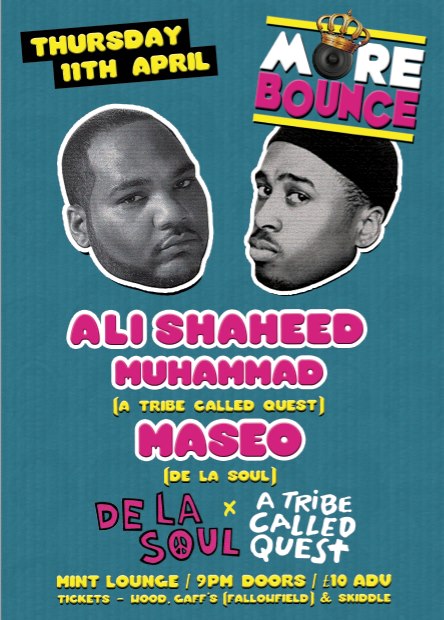 More Bounce present Ali Shaheed Muhammad (A Tribe Called Quest) and Maseo (De La Soul) Thursday 11th April 2013, 9pm, at Mint Lounge. Tickets here.