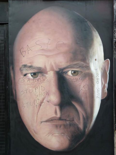 There’s been a hubbub of media attention over the Breaking Bad street art by Akse in Manchester over the past couple of weeks, with the artist contending with continual defacement of his work, seemingly by one persistent individual. Akse fixed the scratches and comments on the piece a couple of times, but yesterday saw paint being splashed over the portrait. His second Breaking Bad piece, DEA agent Hank, has also been amateurishly attacked as seen here – a demonstration of a lack of understanding of the piece being obvious from the slogan ‘pushers out’ being scratched under his eye. Personally I hope we get a snap of this individual and that he becomes the focus of Akse’s next piece – but I’ll settle for Jesse.